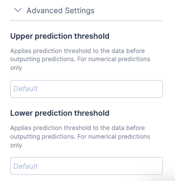 * **Upper Prediction Threshold -** Applied prediction threshold to the data before outputting predictions. This means you can set a max value for the prediction to be able to return for numerical predictions only.