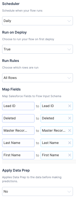 * **Run Rules -** Run against either all rows or rows without predictions. This allows you to input and output the same type of Salesforce field.