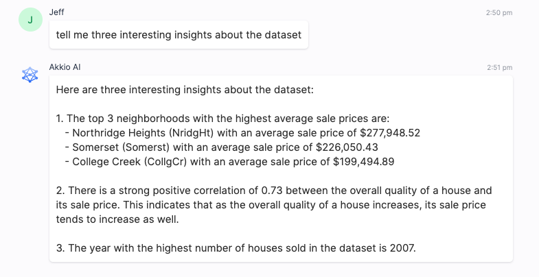 * **Tell me three interesting insights** - Chat Explore can find interesting trends in your data for you.