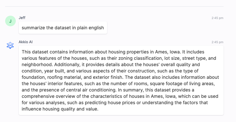 * **Summarize the data in the text** - This will return an overview of the dataset in plain English. This can be useful when exploring unfamiliar data or when generating executive summaries. Try asking for it summarized in an email for specific formatting.