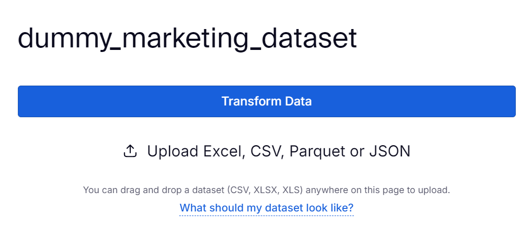 In the Web App, select "Upload Excel, CSV, Parquet, or JSON" to load a new raw data file. Ensure that the new file has the same schema as the original dataset used in the project.