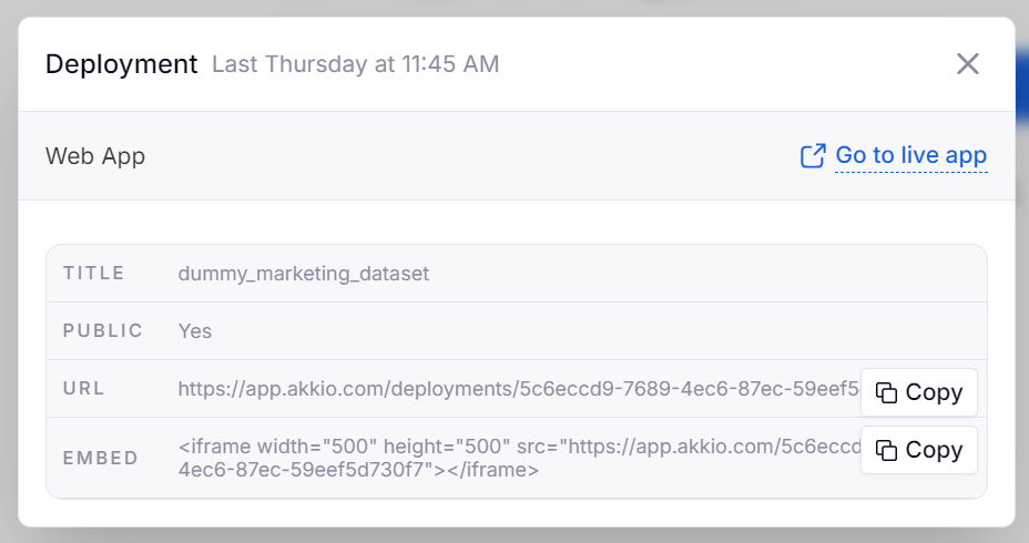 This documentation provides a step-by-step guide on deploying Chat Data Prep within the Akkio platform. The purpose of this feature is to automate data cleaning and transformation processes, significantly reducing the time and effort required to prepare data for analysis and reporting. The deployment can be set up as a Web App or API, allowing for efficient handling of new datasets with the same schema.