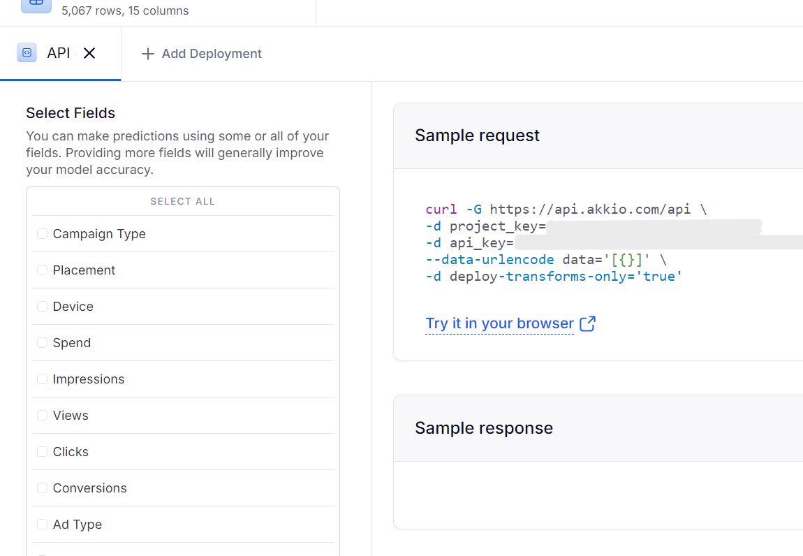 An example curl command is provided. On the left hand side, a list of the dataset’s columns will be shown. Column select is only relevant to [Model Deployment](https://docs.akkio.com/akkio-docs/deploying-a-model/deploy) and has no effect on deployed data preparation.