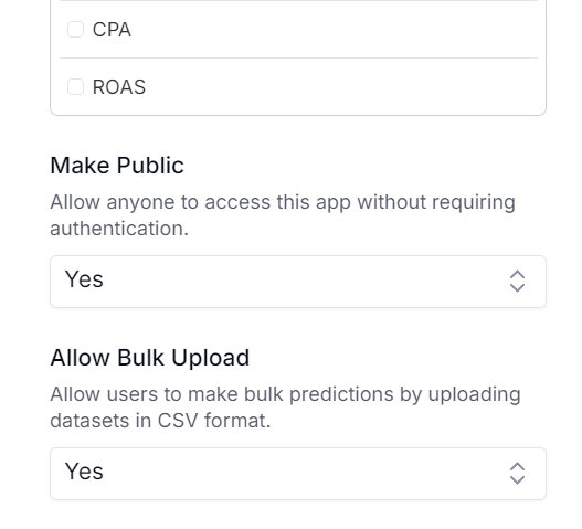 * **Allow Bulk Upload** - Allow users to make bulk predictions by uploading datasets in CSV format. This must remain enabled to upload files for automatic data preparation.