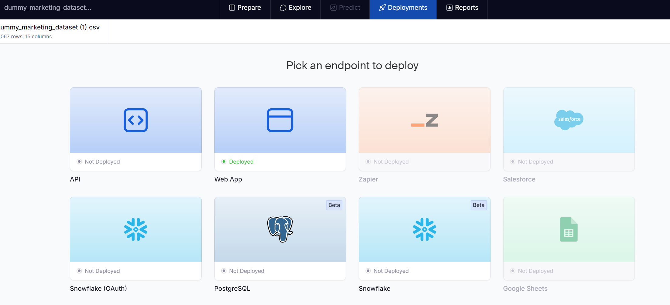 Several endpoint options will be available. These endpoints include Web App, API, and several databases to deploy your dataset transformations to.