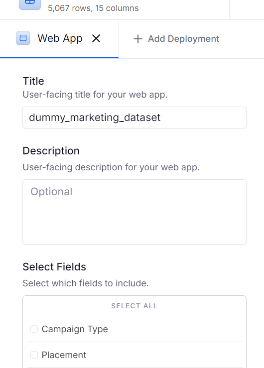 * **Select Fields** - Select which fields to include. This feature is only relevant to [Model Deployment](https://docs.akkio.com/akkio-docs/deploying-a-model/deploy) and has no effect on deployed data preparation.